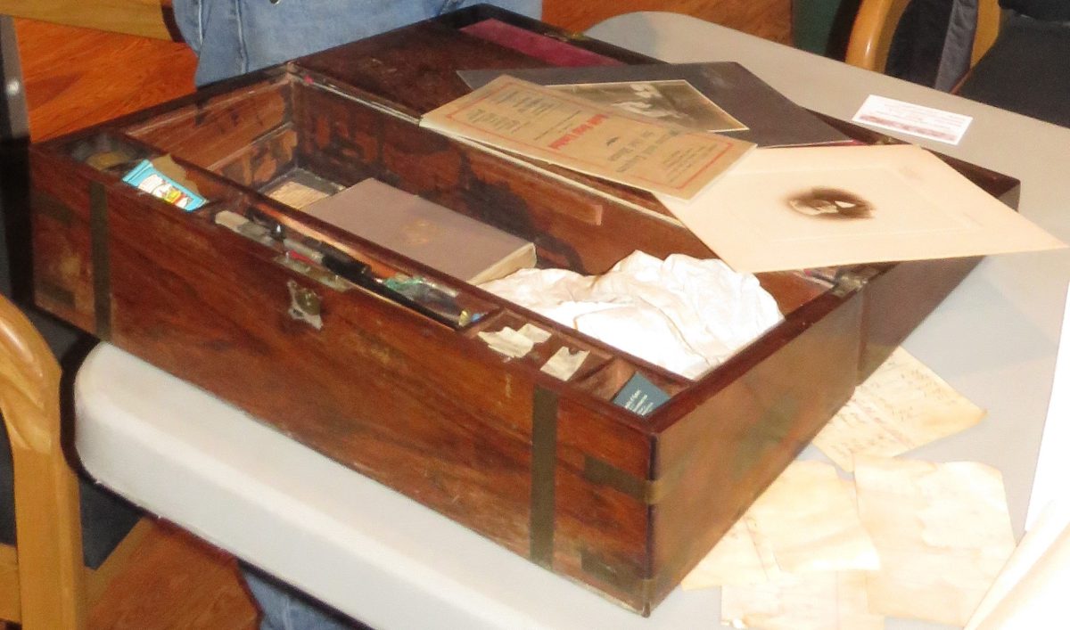 You may wonder what happened to me. Foxcrowle thought of me even in death. There I was on the second page of his Will: “I will and bequeath to Edward H.L. Cook, my son, my little folding desk (formerly his grandfather’s) to be handed over to his control after he has attained his eighteenth birthday.” I had a new owner. I would support him as he shared his letters and business transactions with me. After Ed passed away, I was given to his son, Barrie. Barrie called me FP’s laptop. Sadly, he is also gone, and now I live with his son, Tony. Across an ocean and through Cook generations, each owner has cared for me well. When opened, one can still find the cherished memories placed here by Foxcrowle many years ago. I am just a small, wooden travelling desk. I have experienced many lifetimes of adventure with more yet to come but my favourite years are those spent with my dearest companion, Foxcrowle Percival Cook.